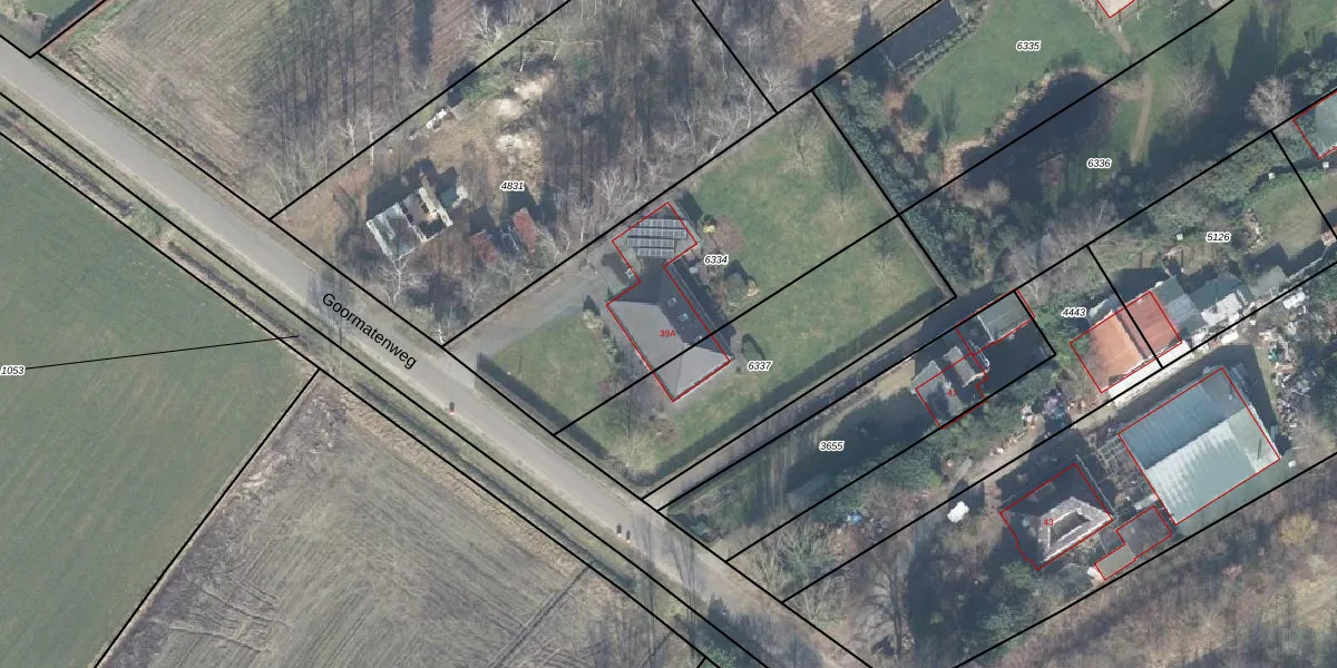Het perceel waarop Goormatenweg 39-A staat heeft een oppervlakte van 1380 m². Dit is een zeer groot perceel. De perceeloppervlakte wordt geregistreerd door het Kadaster. Gedetailleerde informatie over de maten van dit perceel kunt u vinden in het rapport Kadastrale kaart met maatvoering van Goormatenweg 39-A.