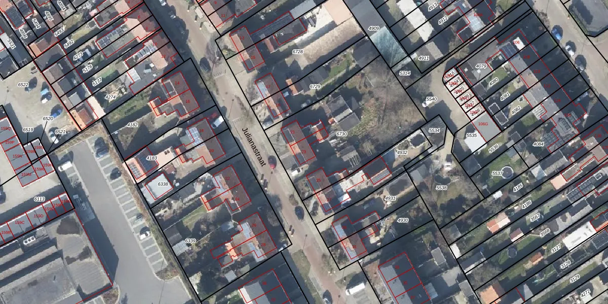 Het perceel waarop Julianastraat 23 staat heeft een oppervlakte van 1250 m². Dit is een zeer groot perceel. De perceeloppervlakte wordt geregistreerd door het Kadaster. Gedetailleerde informatie over de maten van dit perceel kunt u vinden in het rapport Kadastrale kaart met maatvoering van Julianastraat 23.