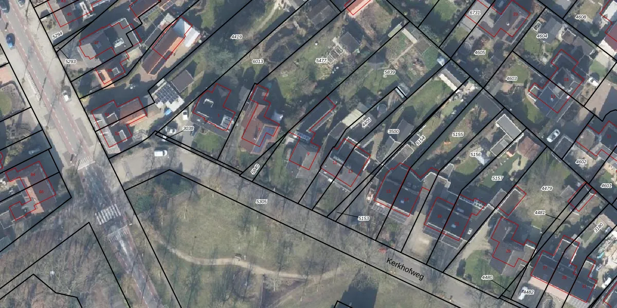 Het perceel waarop Kerkhofweg 9 staat heeft een oppervlakte van 1052 m². Dit is een zeer groot perceel. De perceeloppervlakte wordt geregistreerd door het Kadaster. Gedetailleerde informatie over de maten van dit perceel kunt u vinden in het rapport Kadastrale kaart met maatvoering van Kerkhofweg 9.