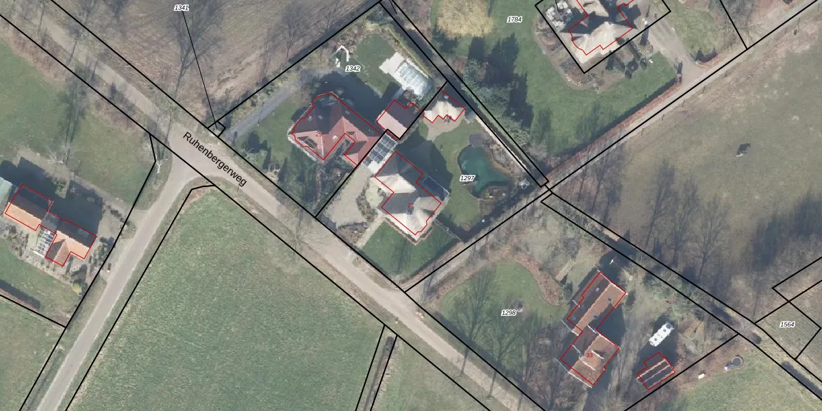 Het perceel waarop Ruhenbergerweg 27 staat heeft een oppervlakte van 1430 m². Dit is een zeer groot perceel. De perceeloppervlakte wordt geregistreerd door het Kadaster. Gedetailleerde informatie over de maten van dit perceel kunt u vinden in het rapport Kadastrale kaart met maatvoering van Ruhenbergerweg 27.