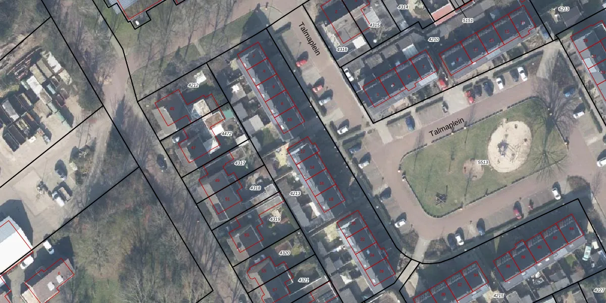 Talmaplein 12 is gelegen op kadastraal perceel LSR00K4213. Deze kadastrale aanduiding is uniek en wordt gebruikt door het Kadaster om eigendomsrechten en andere zakelijke rechten vast te leggen. Het perceel maakt onderdeel uit van de kadastrale gemeente Losser.