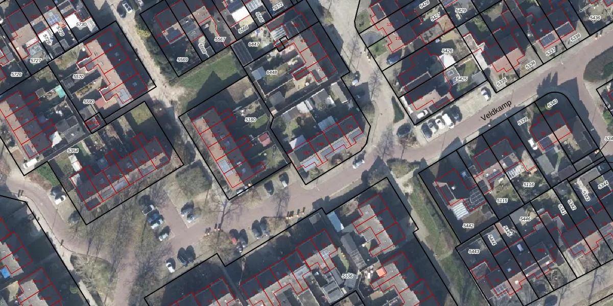 Het perceel waarop Veldkamp 182 staat heeft een oppervlakte van 1219 m². Dit is een zeer groot perceel. De perceeloppervlakte wordt geregistreerd door het Kadaster. Gedetailleerde informatie over de maten van dit perceel kunt u vinden in het rapport Kadastrale kaart met maatvoering van Veldkamp 182.
