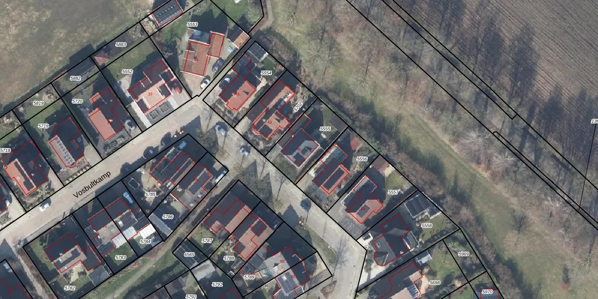 Vosbultkamp 45 is gelegen op kadastraal perceel LSR00K5555. Deze kadastrale aanduiding is uniek en wordt gebruikt door het Kadaster om eigendomsrechten en andere zakelijke rechten vast te leggen. Het perceel maakt onderdeel uit van de kadastrale gemeente Losser.