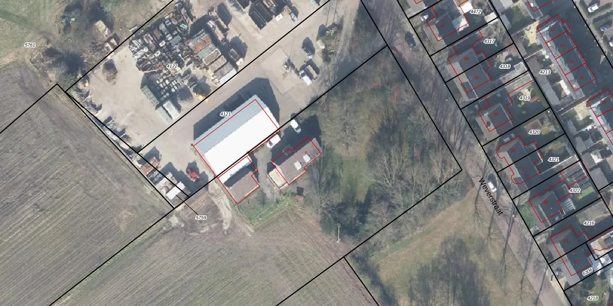 Het perceel waarop Weverstraat 6 staat heeft een oppervlakte van 1,1 ha. Dit is een zeer groot perceel. De perceeloppervlakte wordt geregistreerd door het Kadaster. Gedetailleerde informatie over de maten van dit perceel kunt u vinden in het rapport Kadastrale kaart met maatvoering van Weverstraat 6.