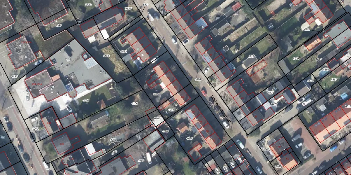 Het perceel waarop Wilhelminastraat 22 staat heeft een oppervlakte van 556 m². Dit is een groot perceel. De perceeloppervlakte wordt geregistreerd door het Kadaster. Gedetailleerde informatie over de maten van dit perceel kunt u vinden in het rapport Kadastrale kaart met maatvoering van Wilhelminastraat 22.