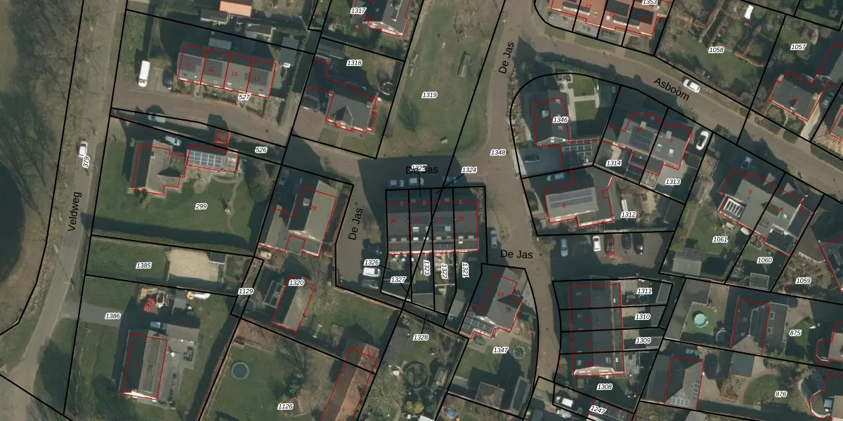 Het perceel waarop De Jas 24 staat heeft een oppervlakte van 80 m². Dit is een klein perceel. De perceeloppervlakte wordt geregistreerd door het Kadaster. Gedetailleerde informatie over de maten van dit perceel kunt u vinden in het rapport Kadastrale kaart met maatvoering van De Jas 24.