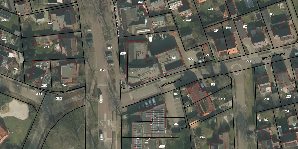 Het perceel waarop Bergkampweg 1-h staat heeft een oppervlakte van 1335 m². Dit is een zeer groot perceel. De perceeloppervlakte wordt geregistreerd door het Kadaster. Gedetailleerde informatie over de maten van dit perceel kunt u vinden in het rapport Kadastrale kaart met maatvoering van Bergkampweg 1-h.