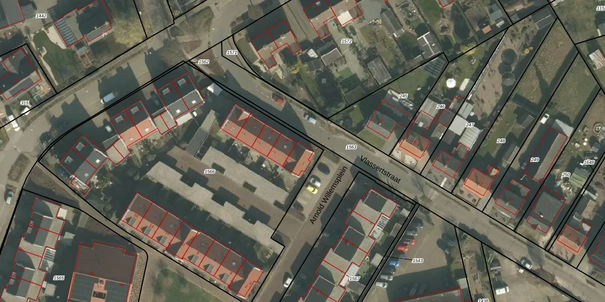 Vlassertstraat 1 is gelegen op kadastraal perceel VLB00I1566. Deze kadastrale aanduiding is uniek en wordt gebruikt door het Kadaster om eigendomsrechten en andere zakelijke rechten vast te leggen. Het perceel maakt onderdeel uit van de kadastrale gemeente Vierlingsbeek.
