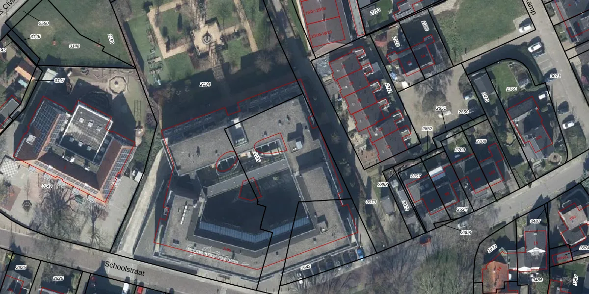 Het perceel waarop Schoolstraat 13 staat heeft een oppervlakte van 1265 m². Dit is een zeer groot perceel. De perceeloppervlakte wordt geregistreerd door het Kadaster. Gedetailleerde informatie over de maten van dit perceel kunt u vinden in het rapport Kadastrale kaart met maatvoering van Schoolstraat 13.