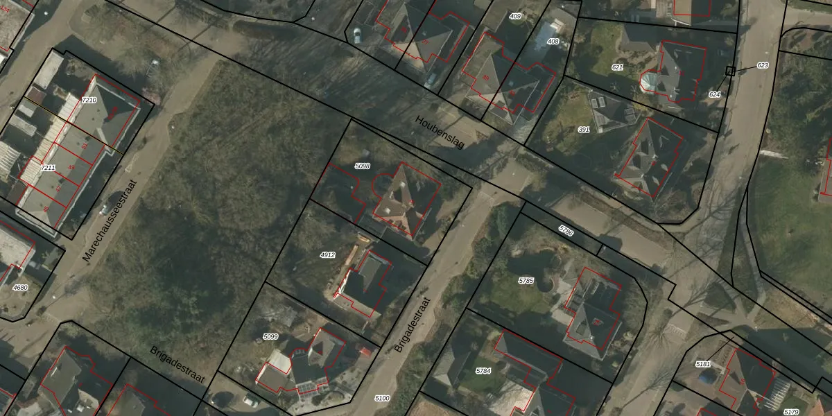 Het perceel waarop Brigadestraat 9 staat heeft een oppervlakte van 713 m². Dit is een groot perceel. De perceeloppervlakte wordt geregistreerd door het Kadaster. Gedetailleerde informatie over de maten van dit perceel kunt u vinden in het rapport Kadastrale kaart met maatvoering van Brigadestraat 9.