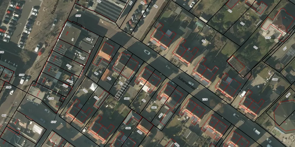 Het perceel waarop Julianastraat 8 staat heeft een oppervlakte van 895 m². Dit is een groot perceel. De perceeloppervlakte wordt geregistreerd door het Kadaster. Gedetailleerde informatie over de maten van dit perceel kunt u vinden in het rapport Kadastrale kaart met maatvoering van Julianastraat 8.