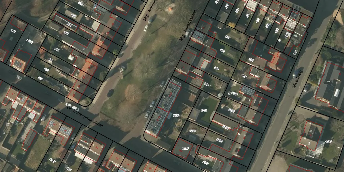Het perceel waarop Mgr. Nolensstraat 9 staat heeft een oppervlakte van 776 m². Dit is een groot perceel. De perceeloppervlakte wordt geregistreerd door het Kadaster. Gedetailleerde informatie over de maten van dit perceel kunt u vinden in het rapport Kadastrale kaart met maatvoering van Mgr. Nolensstraat 9.