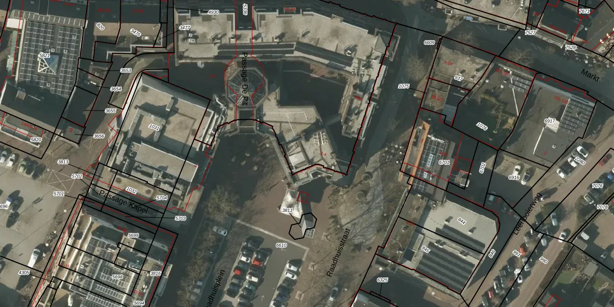 Het perceel waarop Raadhuisplein 2 staat heeft een oppervlakte van 3111 m². Dit is een zeer groot perceel. De perceeloppervlakte wordt geregistreerd door het Kadaster. Gedetailleerde informatie over de maten van dit perceel kunt u vinden in het rapport Kadastrale kaart met maatvoering van Raadhuisplein 2.