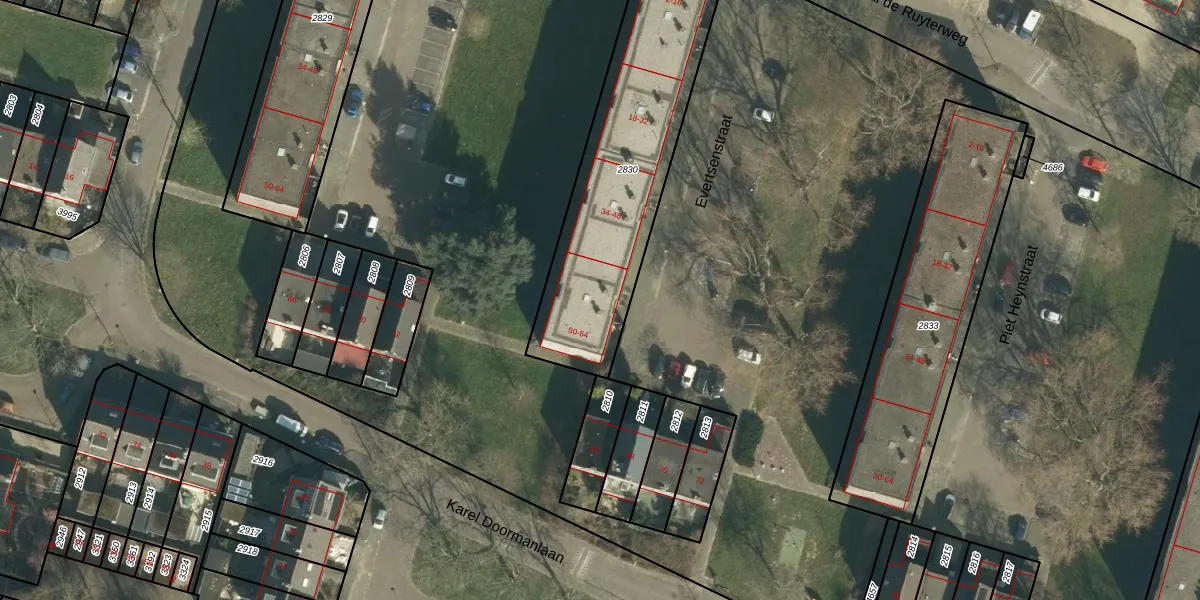 Het perceel waarop Evertsenstraat 54 staat heeft een oppervlakte van 997 m². Dit is een groot perceel. De perceeloppervlakte wordt geregistreerd door het Kadaster. Gedetailleerde informatie over de maten van dit perceel kunt u vinden in het rapport Kadastrale kaart met maatvoering van Evertsenstraat 54.