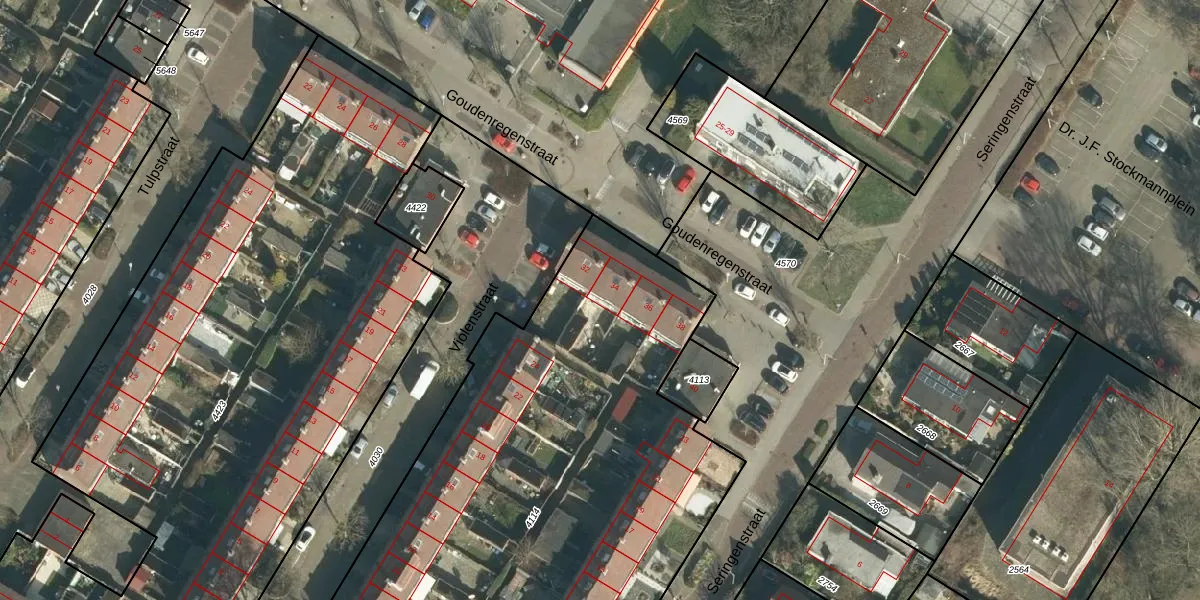Het perceel waarop Goudenregenstraat 34 staat heeft een oppervlakte van 4595 m². Dit is een zeer groot perceel. De perceeloppervlakte wordt geregistreerd door het Kadaster. Gedetailleerde informatie over de maten van dit perceel kunt u vinden in het rapport Kadastrale kaart met maatvoering van Goudenregenstraat 34.