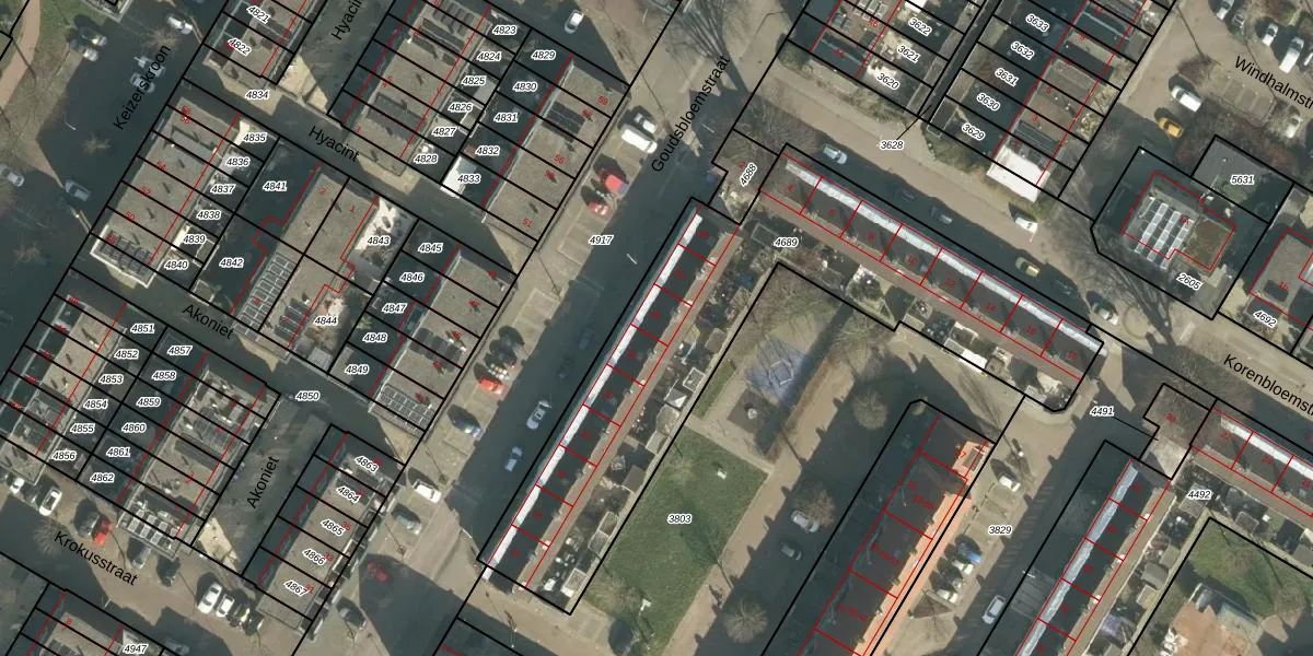 Het perceel waarop Goudsbloemstraat 34 staat heeft een oppervlakte van 1910 m². Dit is een zeer groot perceel. De perceeloppervlakte wordt geregistreerd door het Kadaster. Gedetailleerde informatie over de maten van dit perceel kunt u vinden in het rapport Kadastrale kaart met maatvoering van Goudsbloemstraat 34.