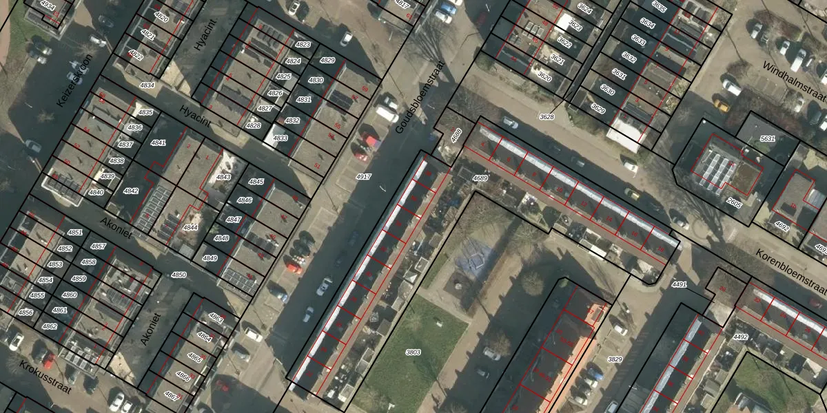 Het perceel waarop Goudsbloemstraat 36 staat heeft een oppervlakte van 1910 m². Dit is een zeer groot perceel. De perceeloppervlakte wordt geregistreerd door het Kadaster. Gedetailleerde informatie over de maten van dit perceel kunt u vinden in het rapport Kadastrale kaart met maatvoering van Goudsbloemstraat 36.