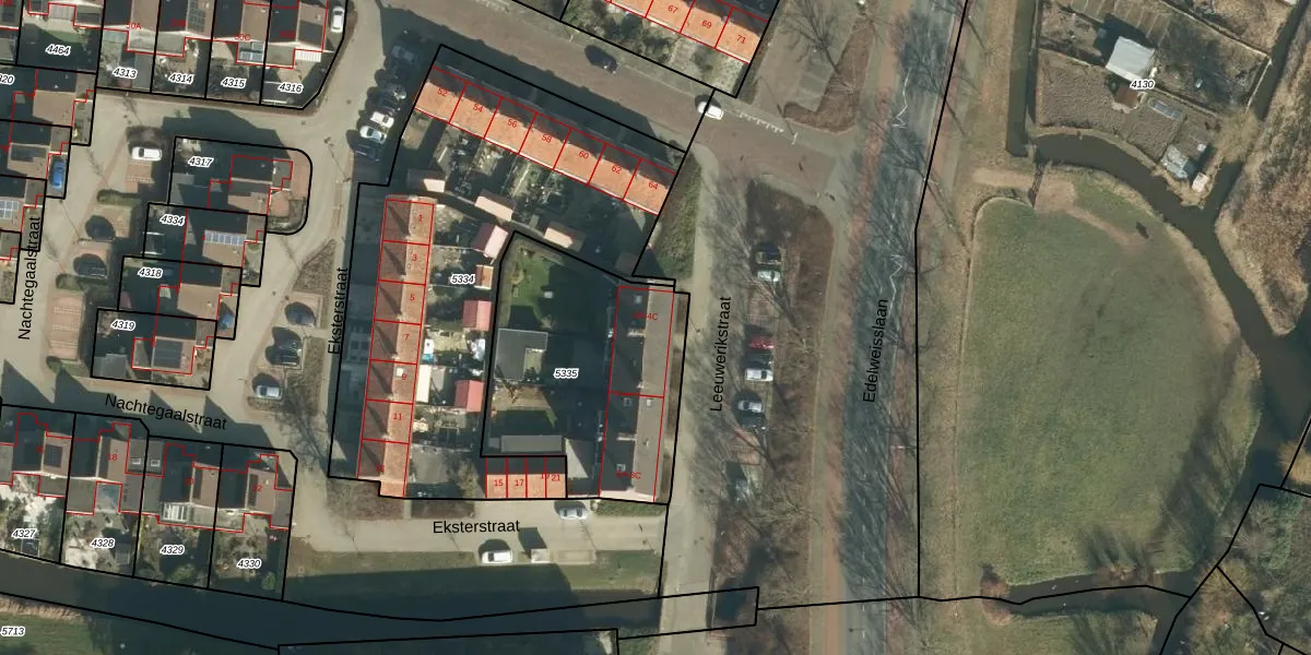 Het perceel waarop Leeuwerikstraat 2-A staat heeft een oppervlakte van 955 m². Dit is een groot perceel. De perceeloppervlakte wordt geregistreerd door het Kadaster. Gedetailleerde informatie over de maten van dit perceel kunt u vinden in het rapport Kadastrale kaart met maatvoering van Leeuwerikstraat 2-A.