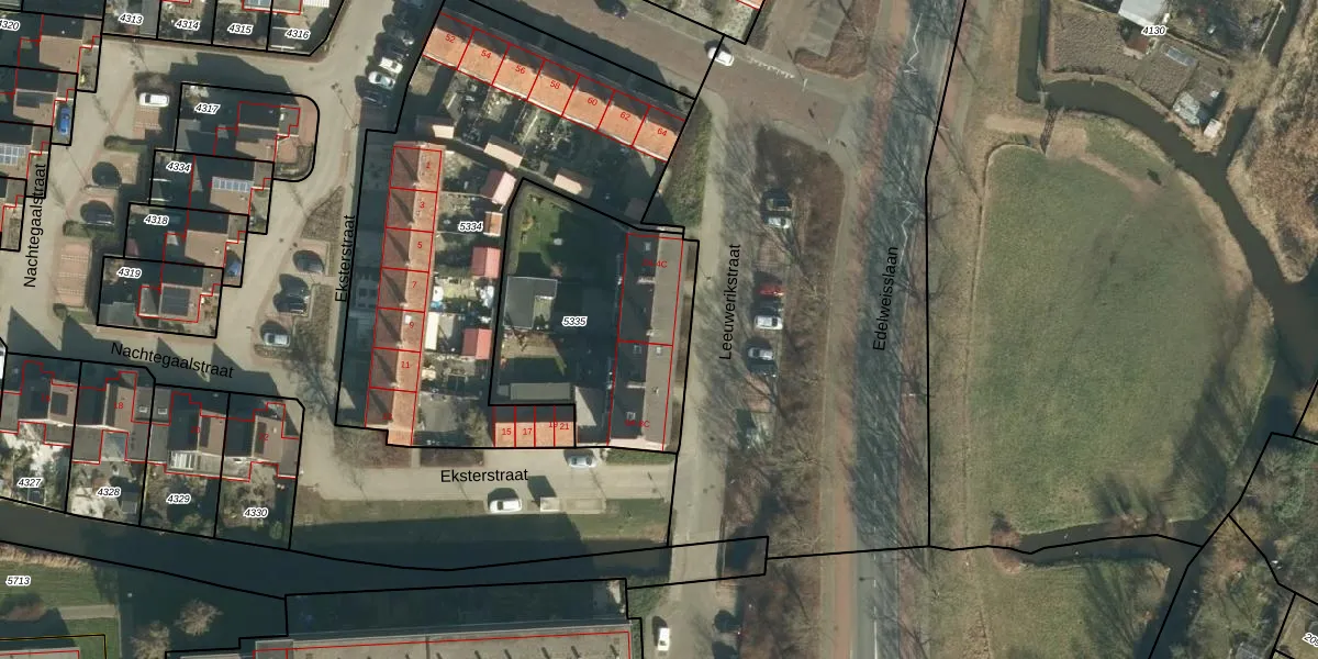 Het perceel waarop Leeuwerikstraat 4-A staat heeft een oppervlakte van 955 m². Dit is een groot perceel. De perceeloppervlakte wordt geregistreerd door het Kadaster. Gedetailleerde informatie over de maten van dit perceel kunt u vinden in het rapport Kadastrale kaart met maatvoering van Leeuwerikstraat 4-A.
