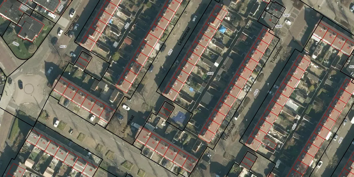Het perceel waarop Leliestraat 8 staat heeft een oppervlakte van 4490 m². Dit is een zeer groot perceel. De perceeloppervlakte wordt geregistreerd door het Kadaster. Gedetailleerde informatie over de maten van dit perceel kunt u vinden in het rapport Kadastrale kaart met maatvoering van Leliestraat 8.