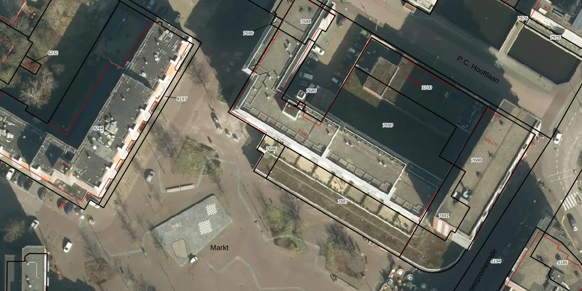 Het perceel waarop Markt 11 staat heeft een oppervlakte van 2265 m². Dit is een zeer groot perceel. De perceeloppervlakte wordt geregistreerd door het Kadaster. Gedetailleerde informatie over de maten van dit perceel kunt u vinden in het rapport Kadastrale kaart met maatvoering van Markt 11.