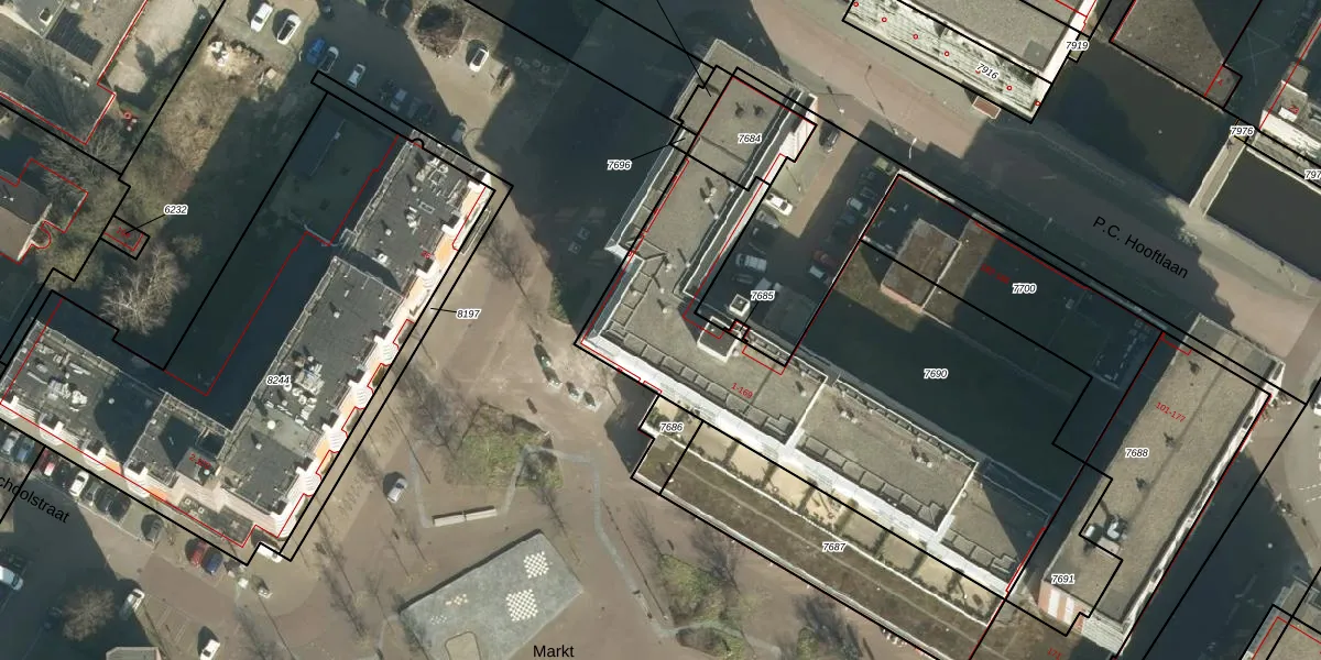 Het perceel waarop Markt 113 staat heeft een oppervlakte van 2265 m². Dit is een zeer groot perceel. De perceeloppervlakte wordt geregistreerd door het Kadaster. Gedetailleerde informatie over de maten van dit perceel kunt u vinden in het rapport Kadastrale kaart met maatvoering van Markt 113.