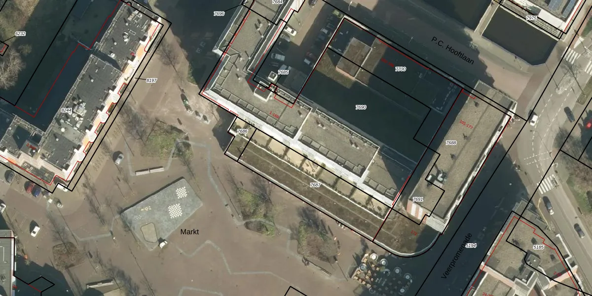 Het perceel waarop Markt 15 staat heeft een oppervlakte van 2265 m². Dit is een zeer groot perceel. De perceeloppervlakte wordt geregistreerd door het Kadaster. Gedetailleerde informatie over de maten van dit perceel kunt u vinden in het rapport Kadastrale kaart met maatvoering van Markt 15.