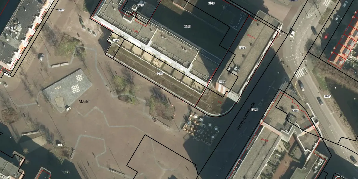Het perceel waarop Markt 169 staat heeft een oppervlakte van 691 m². Dit is een groot perceel. De perceeloppervlakte wordt geregistreerd door het Kadaster. Gedetailleerde informatie over de maten van dit perceel kunt u vinden in het rapport Kadastrale kaart met maatvoering van Markt 169.