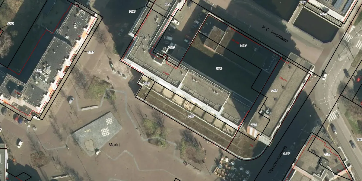 Het perceel waarop Markt 41 staat heeft een oppervlakte van 2265 m². Dit is een zeer groot perceel. De perceeloppervlakte wordt geregistreerd door het Kadaster. Gedetailleerde informatie over de maten van dit perceel kunt u vinden in het rapport Kadastrale kaart met maatvoering van Markt 41.