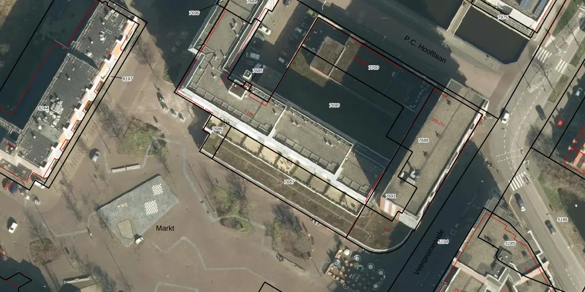 Het perceel waarop Markt 69 staat heeft een oppervlakte van 2265 m². Dit is een zeer groot perceel. De perceeloppervlakte wordt geregistreerd door het Kadaster. Gedetailleerde informatie over de maten van dit perceel kunt u vinden in het rapport Kadastrale kaart met maatvoering van Markt 69.