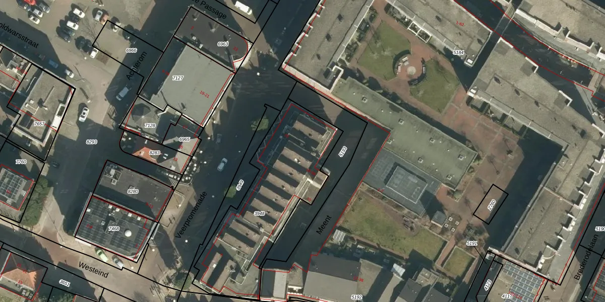 Het perceel waarop Meent 40 staat heeft een oppervlakte van 1367 m². Dit is een zeer groot perceel. De perceeloppervlakte wordt geregistreerd door het Kadaster. Gedetailleerde informatie over de maten van dit perceel kunt u vinden in het rapport Kadastrale kaart met maatvoering van Meent 40.