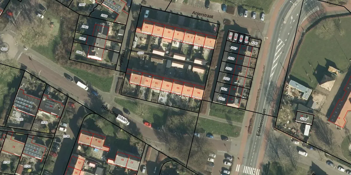Het perceel waarop Scheidingslaan 65 staat heeft een oppervlakte van 2385 m². Dit is een zeer groot perceel. De perceeloppervlakte wordt geregistreerd door het Kadaster. Gedetailleerde informatie over de maten van dit perceel kunt u vinden in het rapport Kadastrale kaart met maatvoering van Scheidingslaan 65.