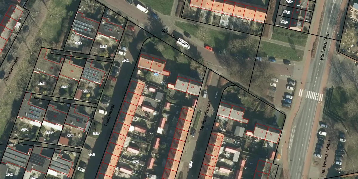 Het perceel waarop Scheidingslaan 68 staat heeft een oppervlakte van 4639 m². Dit is een zeer groot perceel. De perceeloppervlakte wordt geregistreerd door het Kadaster. Gedetailleerde informatie over de maten van dit perceel kunt u vinden in het rapport Kadastrale kaart met maatvoering van Scheidingslaan 68.