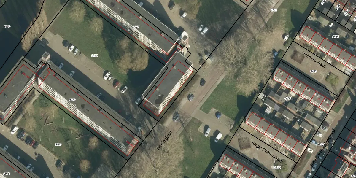 Het perceel waarop Staringlaan 196 staat heeft een oppervlakte van 1504 m². Dit is een zeer groot perceel. De perceeloppervlakte wordt geregistreerd door het Kadaster. Gedetailleerde informatie over de maten van dit perceel kunt u vinden in het rapport Kadastrale kaart met maatvoering van Staringlaan 196.