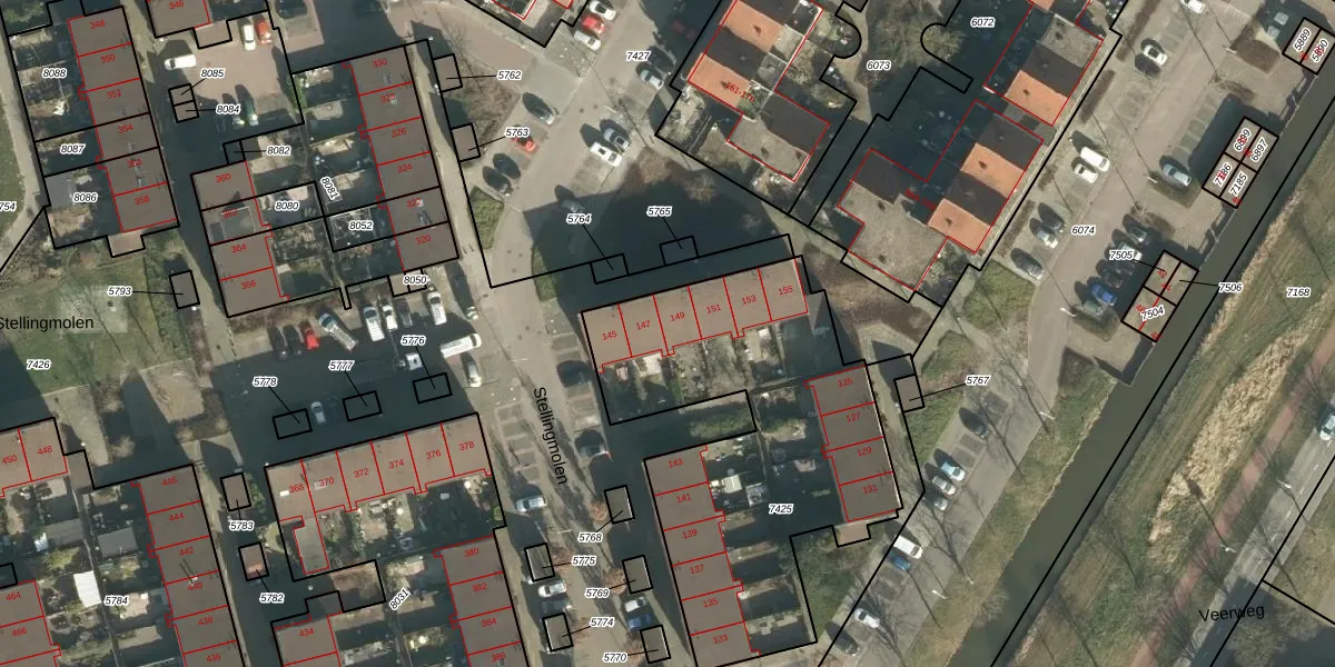 Het perceel waarop Stellingmolen 149 staat heeft een oppervlakte van 1657 m². Dit is een zeer groot perceel. De perceeloppervlakte wordt geregistreerd door het Kadaster. Gedetailleerde informatie over de maten van dit perceel kunt u vinden in het rapport Kadastrale kaart met maatvoering van Stellingmolen 149.