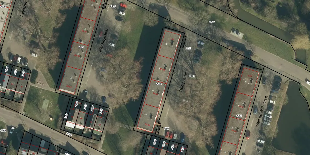 Het perceel waarop Trompstraat 30 staat heeft een oppervlakte van 996 m². Dit is een groot perceel. De perceeloppervlakte wordt geregistreerd door het Kadaster. Gedetailleerde informatie over de maten van dit perceel kunt u vinden in het rapport Kadastrale kaart met maatvoering van Trompstraat 30.