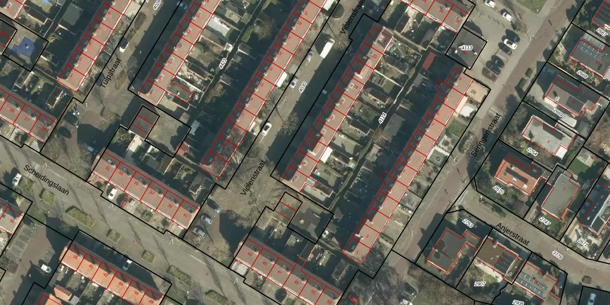 Het perceel waarop Violenstraat 10 staat heeft een oppervlakte van 4595 m². Dit is een zeer groot perceel. De perceeloppervlakte wordt geregistreerd door het Kadaster. Gedetailleerde informatie over de maten van dit perceel kunt u vinden in het rapport Kadastrale kaart met maatvoering van Violenstraat 10.