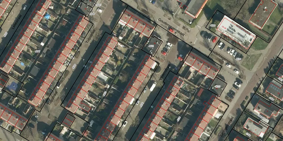 Het perceel waarop Violenstraat 21 staat heeft een oppervlakte van 4433 m². Dit is een zeer groot perceel. De perceeloppervlakte wordt geregistreerd door het Kadaster. Gedetailleerde informatie over de maten van dit perceel kunt u vinden in het rapport Kadastrale kaart met maatvoering van Violenstraat 21.