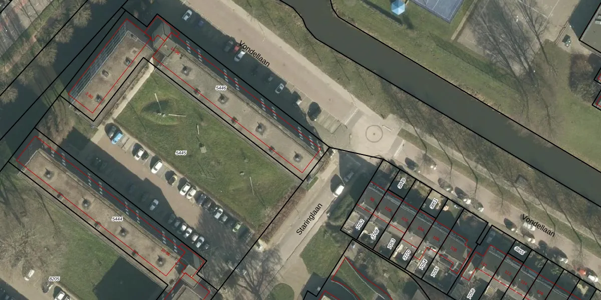 Het perceel waarop Vondellaan 48 staat heeft een oppervlakte van 1500 m². Dit is een zeer groot perceel. De perceeloppervlakte wordt geregistreerd door het Kadaster. Gedetailleerde informatie over de maten van dit perceel kunt u vinden in het rapport Kadastrale kaart met maatvoering van Vondellaan 48.