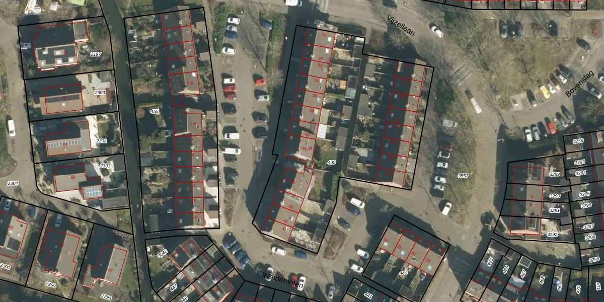 Het perceel waarop Weidemolen 47 staat heeft een oppervlakte van 2650 m². Dit is een zeer groot perceel. De perceeloppervlakte wordt geregistreerd door het Kadaster. Gedetailleerde informatie over de maten van dit perceel kunt u vinden in het rapport Kadastrale kaart met maatvoering van Weidemolen 47.