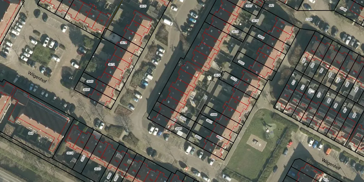 Het perceel waarop Wilgenhof 63 staat heeft een oppervlakte van 1998 m². Dit is een zeer groot perceel. De perceeloppervlakte wordt geregistreerd door het Kadaster. Gedetailleerde informatie over de maten van dit perceel kunt u vinden in het rapport Kadastrale kaart met maatvoering van Wilgenhof 63.