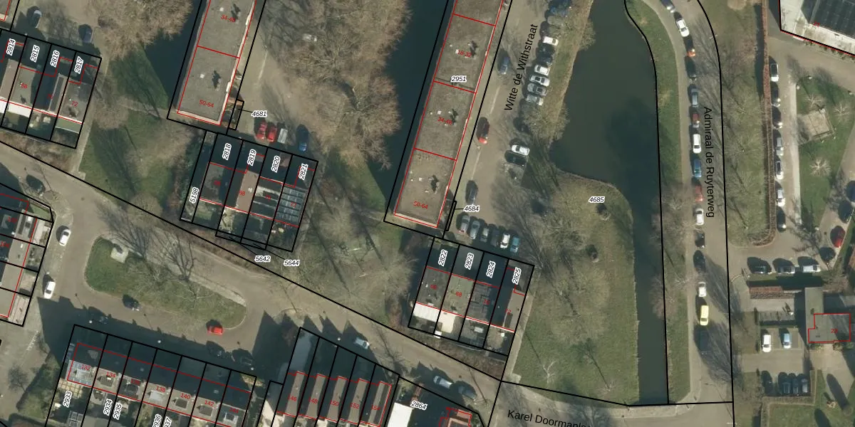 Het perceel waarop Witte de Withstraat 56 staat heeft een oppervlakte van 997 m². Dit is een groot perceel. De perceeloppervlakte wordt geregistreerd door het Kadaster. Gedetailleerde informatie over de maten van dit perceel kunt u vinden in het rapport Kadastrale kaart met maatvoering van Witte de Withstraat 56.