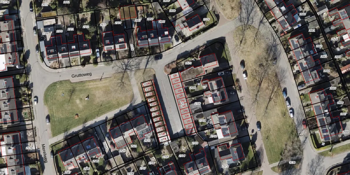 Gruttoweg 13-v is gelegen op kadastraal perceel EDE02B2523. Deze kadastrale aanduiding is uniek en wordt gebruikt door het Kadaster om eigendomsrechten en andere zakelijke rechten vast te leggen. Het perceel maakt onderdeel uit van de kadastrale gemeente Eelde.