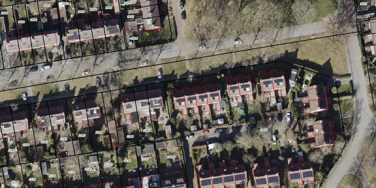 Het perceel waarop Helmerdijk 36 staat heeft een oppervlakte van 5863 m². Dit is een zeer groot perceel. De perceeloppervlakte wordt geregistreerd door het Kadaster. Gedetailleerde informatie over de maten van dit perceel kunt u vinden in het rapport Kadastrale kaart met maatvoering van Helmerdijk 36.