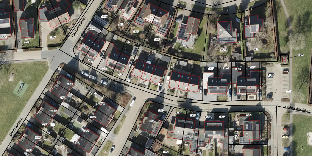 Het perceel waarop Dubbellooflaan 34 staat heeft een oppervlakte van 1173 m². Dit is een zeer groot perceel. De perceeloppervlakte wordt geregistreerd door het Kadaster. Gedetailleerde informatie over de maten van dit perceel kunt u vinden in het rapport Kadastrale kaart met maatvoering van Dubbellooflaan 34.