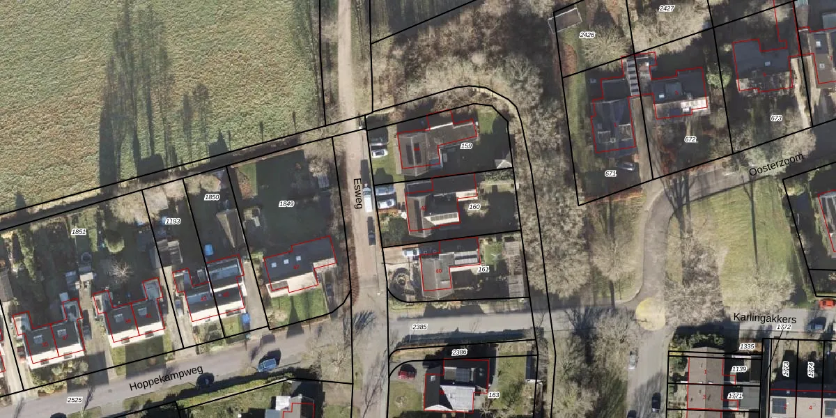 Het perceel waarop Esweg 42 staat heeft een oppervlakte van 510 m². Dit is een groot perceel. De perceeloppervlakte wordt geregistreerd door het Kadaster. Gedetailleerde informatie over de maten van dit perceel kunt u vinden in het rapport Kadastrale kaart met maatvoering van Esweg 42.