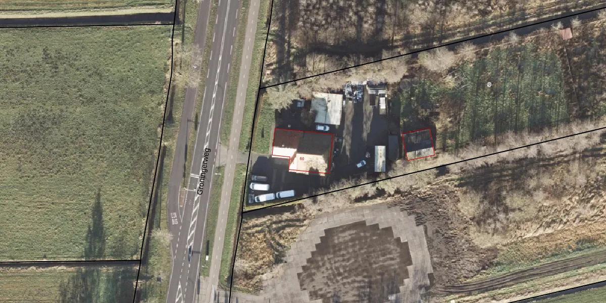 Het perceel waarop Groningerweg 60 staat heeft een oppervlakte van 7300 m². Dit is een zeer groot perceel. De perceeloppervlakte wordt geregistreerd door het Kadaster. Gedetailleerde informatie over de maten van dit perceel kunt u vinden in het rapport Kadastrale kaart met maatvoering van Groningerweg 60.