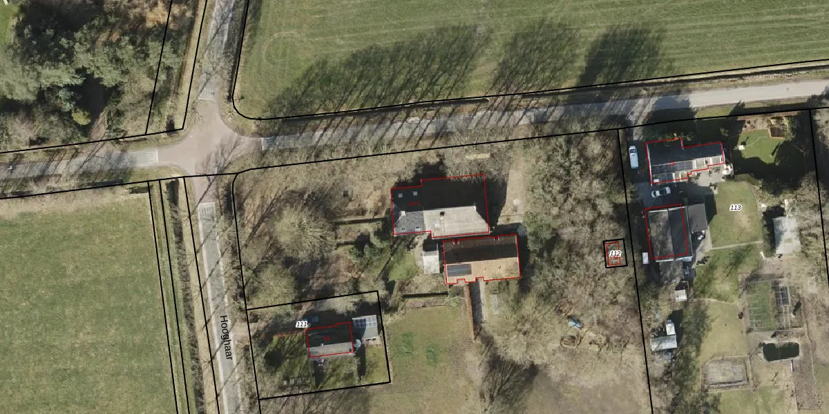 Het perceel waarop Hooghaar 1 staat heeft een oppervlakte van 8415 m². Dit is een zeer groot perceel. De perceeloppervlakte wordt geregistreerd door het Kadaster. Gedetailleerde informatie over de maten van dit perceel kunt u vinden in het rapport Kadastrale kaart met maatvoering van Hooghaar 1.