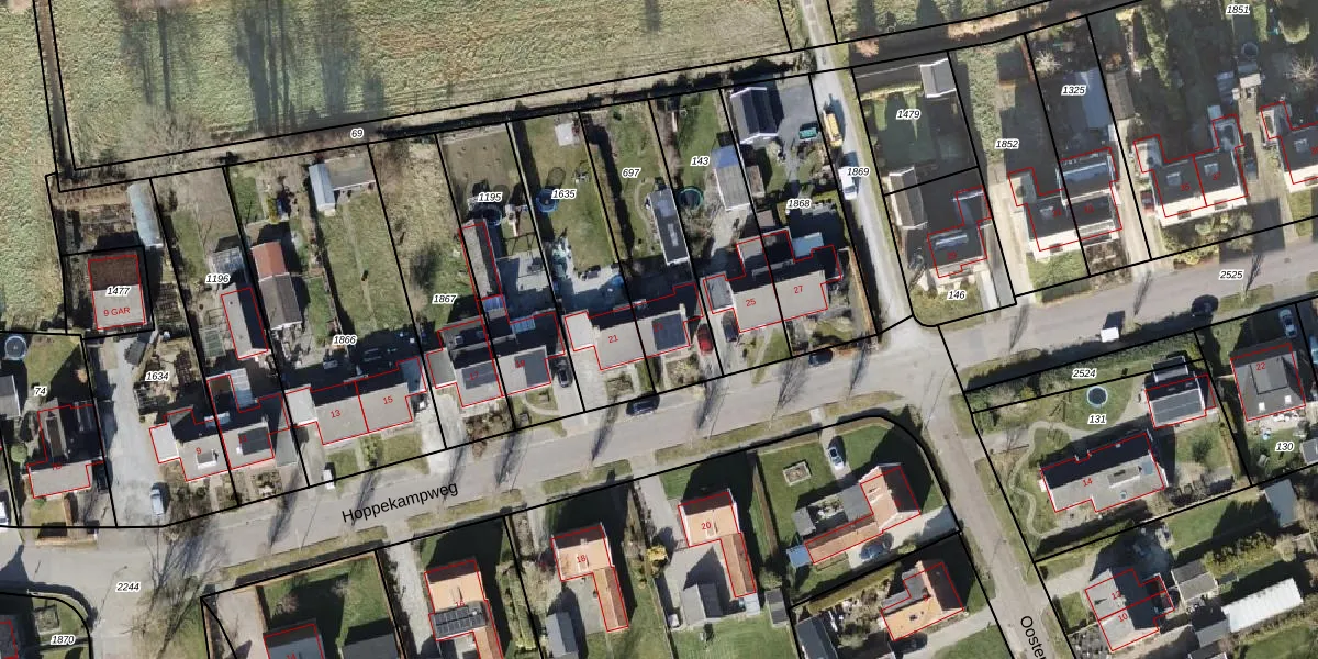 Het perceel waarop Hoppekampweg 23 staat heeft een oppervlakte van 477 m². Dit is een groot perceel. De perceeloppervlakte wordt geregistreerd door het Kadaster. Gedetailleerde informatie over de maten van dit perceel kunt u vinden in het rapport Kadastrale kaart met maatvoering van Hoppekampweg 23.