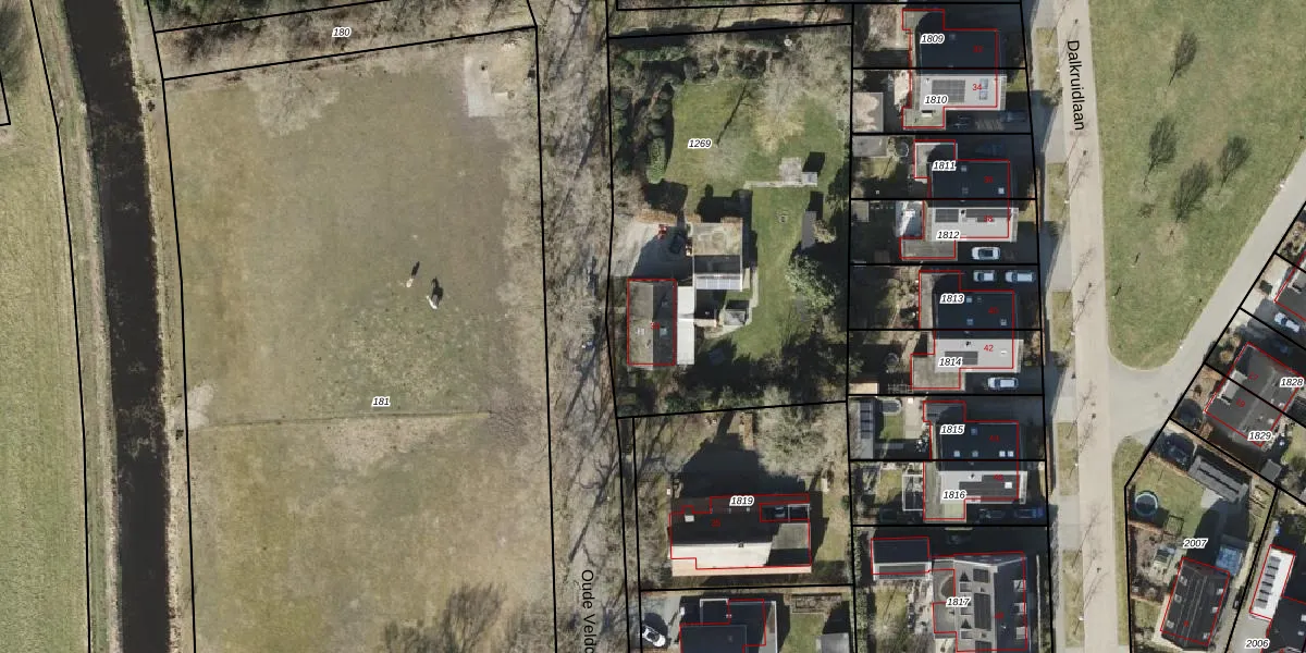 Het perceel waarop Oude Velddijk 33 staat heeft een oppervlakte van 2130 m². Dit is een zeer groot perceel. De perceeloppervlakte wordt geregistreerd door het Kadaster. Gedetailleerde informatie over de maten van dit perceel kunt u vinden in het rapport Kadastrale kaart met maatvoering van Oude Velddijk 33.